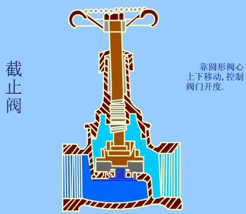 截止阀的原理:截止阀由阀瓣密封面和阀座密封面组成,阀杆带动阀瓣沿阀座的中心线作垂直运动。截止阀启闭过程中启高度较小,易于流量的调节,且制造维修方便,压力适用范围广。