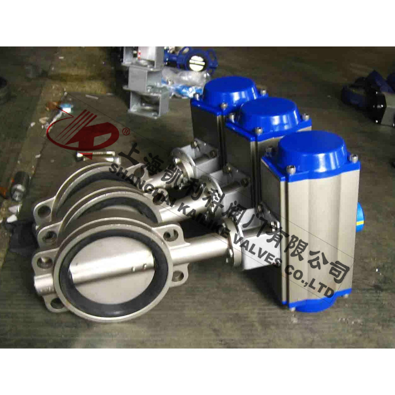 D671X气动对夹式软密封蝶阀是由气动活塞式执行器、橡胶密封蝶阀和碳钢或不锈钢阀板、阀杆构成。气动对夹式软密封蝶阀适用于温度≤120℃如食品、医药、化工、石油、电力、轻纺、造纸等给排水、气体管道上作调节流量和截流介质的作用。