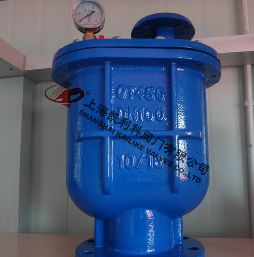当管内开始注水时,塞头停留在开启位置,进行大量排气,当空气排完时,阀内积水浮球被浮起,传动塞头至关闭位置,停止大量排气;当管内水正常输送时,如有少量空气聚集在阀内到相当程度,阀内水位下降,浮球随之下降,此时空气则由小孔排出。当抽水机停止,管内水流空时,或遇管内产生负压时,此时塞头开启,吸入空气确保管线安全。