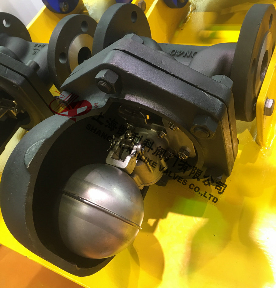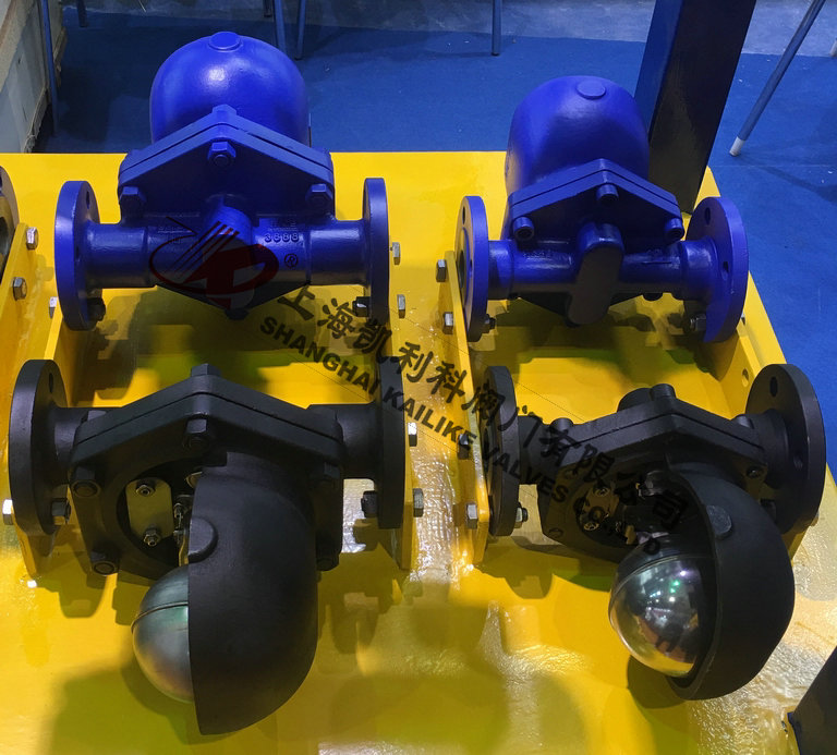 该阀刚启动时,自动排空气装置迅速排除系统中不凝结气体,当蒸汽和热凝结水进入后,阀腔内温度随着升高,排空气装置自动关闭,浮球根据凝结水水位的变化而作升降,带动杠杆调节阀座孔的开度,连续排放凝结水。当凝结水停止进入时,浮球靠自重下降,驱使杠杆带动阀芯关闭排水阀座孔。