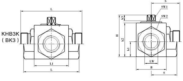 KHB3K高压三通球阀有T型和L型。T型能使三条正交的管道相互联通和切断第三条通道,起分流、合流作用。L型只能连接相互正交的两条管道,不能同时保持第三条管道的相互连通,只起分配作用。